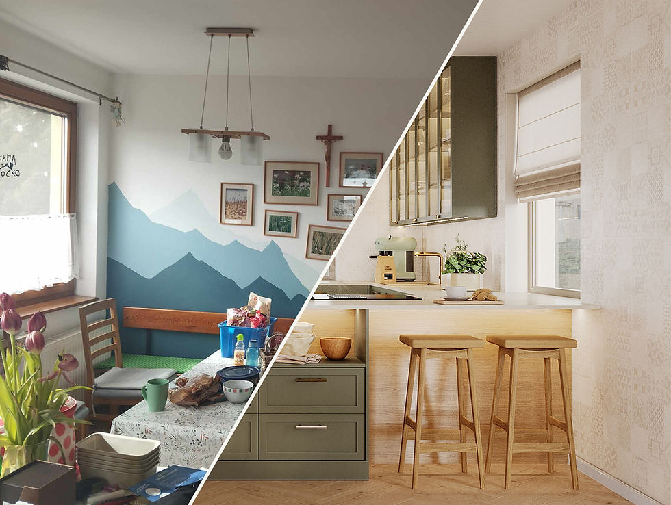 Rekonštrukcia pridala potrebný priestor a vytvorila vidiecku kuchyňu v tlmenej zelenej. Moderné technológie sú ukryté tak, aby nenarušili útulný charakter a domácku atmosféru.